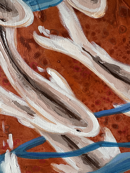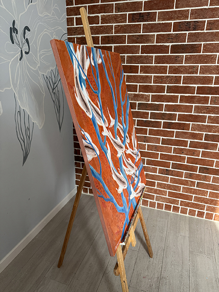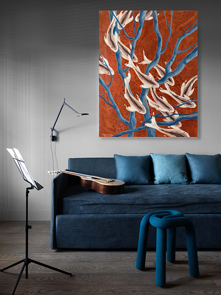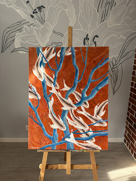 На картине изображено переплетение голубых ветвей на ярком терракотовом фоне, стая рыбок кои кружит свой хоровод среди них. Рыбки словно яркие искры, кружатся в своем безмолвном танце, напоминая о вечном движении жизни. Каждый их поворот, каждое мерцание чешуи — это отдельная история, отдельная мечта, стремящаяся к исполнению. Ведь именно кои, в своей символике, несут в себе идею преодоления препятствий и достижения желаемого, напоминая нам о силе духа и несгибаемой воле. Закатное солнце, играющее своими лучами на поверхности «Терракотовой реки», придает картине особое очарование. Необыкновенные оттенки: от нежно-розового до насыщенного оранжевого — словно обволакивают зрителя, погружая его в мир грез и размышлений. В этот момент, кажется, что дальние страны и неизведанные горизонты становятся ближе, а мечты о путешествиях — вполне осуществимыми. Картина выполнена акриловыми красками на льняном холсте, края прокрашены, ее можно вешать без рамы. Картина покрыта лаком от выцветания и пыли, она сохранит яркость на десятилетия. Натуральный льняной холст натянут на подрамник. Ширина подрамника 2 см.