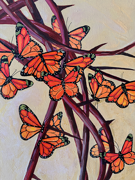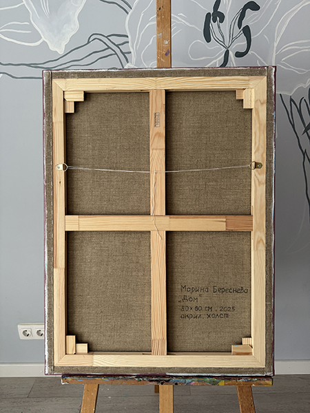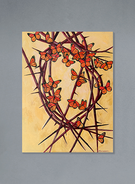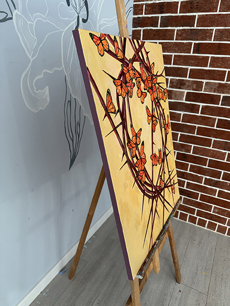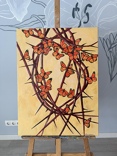 На картине изображен абстрактный дом, он напоминает кокон, сотканный из веток с колючками. Дом с шипами символизирует защиту и укрытие и, одновременно, изоляцию. Яркие оранжевые бабочки, танцующие среди колючек, представляют красоту и хрупкость жизни, которая наполняет пустые «стены» дома. Этот контраст между холодностью колючек и нежностью бабочек подчеркивает, что дом — это всего лишь место, а живым, теплым, душевным его делают люди, которые в нем живут. Картина выполнена акриловыми и масляными красками на льняном холсте, натянута на подрамник. Края картины прокрашены, ее можно вешать без рамы. Картина покрыта лаком от выцветания и пыли, она сохранит яркость на десятилетия. Размер 80х60 см, ширина подрамника 2 см.