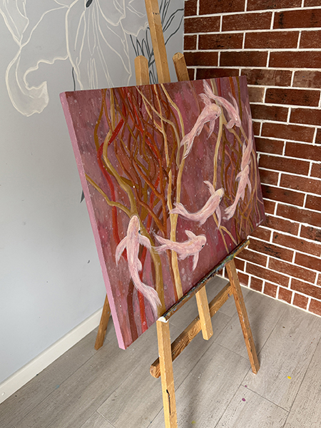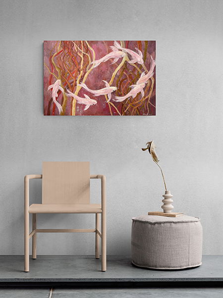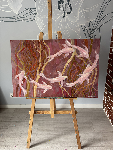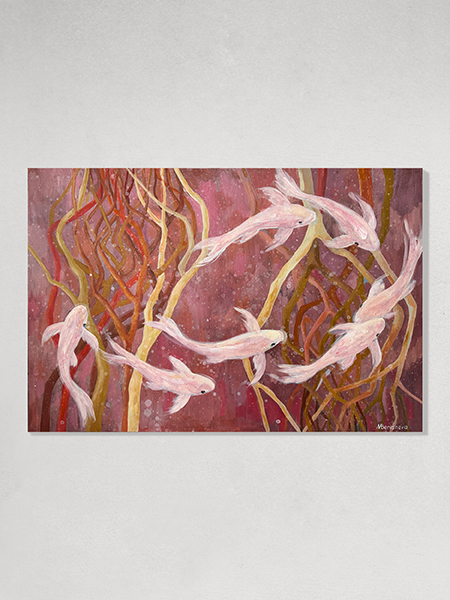 Картина «Два гнезда» представляет собой вдумчивую композицию, погружающую зрителя в размышления о выборе своего места. На фоне водной глади, выполненной в теплых оттенках красного, коричневого и терракотового, изображены два гнезда из веток. Одно из гнезд привлекает к себе изящную стаю рыб, которые направляются к нему с очевидной целеустремленностью. В то же время, другое гнездо, расположенное неподалеку, остается пустым, обходимым стороной. Эта сцена заставляет задуматься о причинах, по которым живые существа, а возможно и мы сами, выбирают определенные места для жизни, оставляя другие нетронутыми. Автор картины, через этот символический образ, приглашает зрителя к размышлению о природе выбора, привлекательности и отвержении, подчеркивая, что даже в природе, как и в человеческой жизни, выбор места обитания не случаен, а обусловлен множеством факторов. Картина выполнена акриловыми и масляными красками на льняном холсте, натянута на подрамник. Края картины прокрашены, ее можно вешать без рамы. Картина покрыта лаком от выцветания и пыли, она сохранит яркость на десятилетия.
