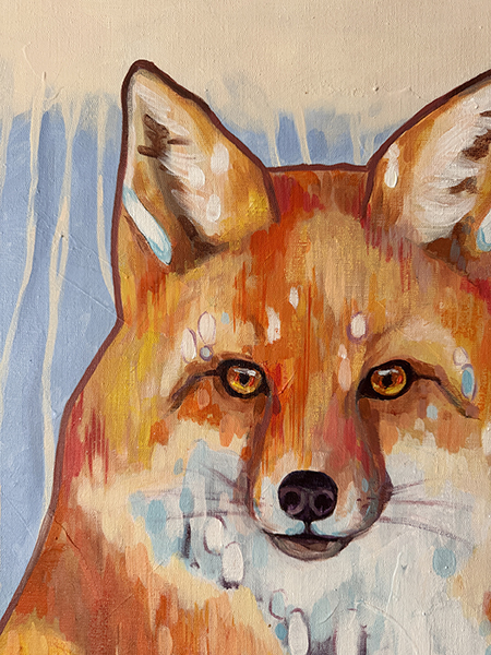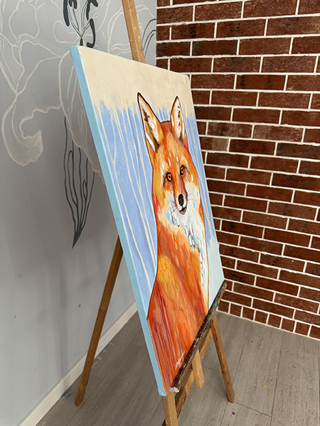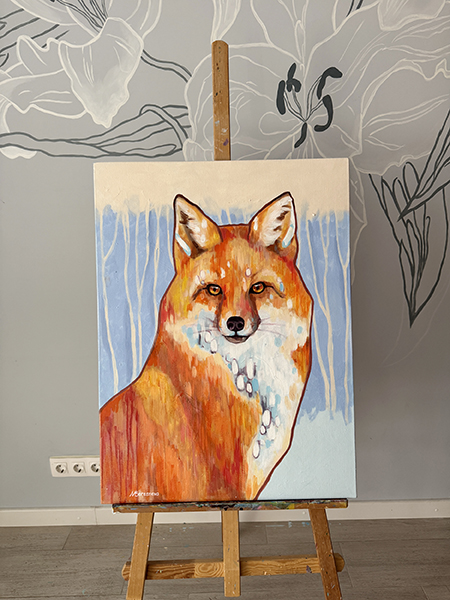 На картине изображена рыжая лиса, стоящая на фоне зимнего леса, где деревья покрыты снегом. Лиса выглядит живой и внимательной, её глаза притягивают взгляд своей выразительностью. Цветовая палитра картины сочетает в себе теплые терракотовые тона шерсти лисы с холодными оттенками зимнего пейзажа, создавая контраст между жизненной энергией животного и тихой, снежной красотой природы. Лисиц считают хитрыми животными из-за их поведения и способности выживать в различных условиях. Они известны своей ловкостью и умом в охоте, умении избегать опасностей и хитроумных способах добывания пищи. В фольклоре и сказках лисы часто изображаются как хитрые персонажи, что закрепило за ними этот образ. Картина выполнена акриловыми и масляными красками на льняном холсте, натянута на подрамник. Края картины прокрашены, ее можно вешать без рамы. Картина покрыта лаком от выцветания и пыли, она сохранит яркость на десятилетия. Размер 80*60 см, ширина подрамника 2.