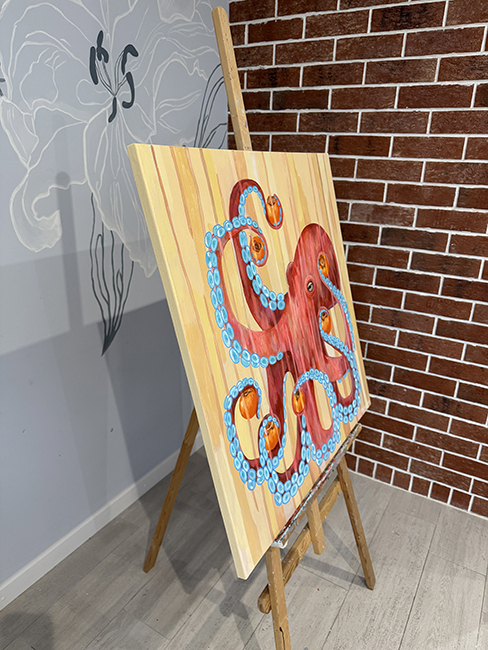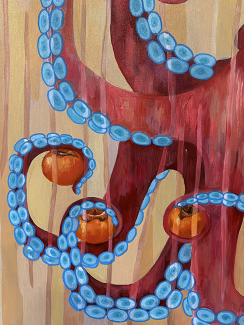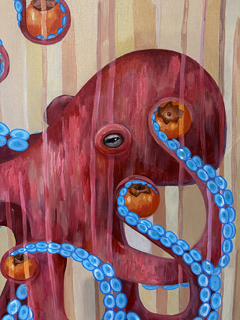 На картине изображен радостный осьминог, который во всех своих щупальцах держит сочные плоды хурмы. Осьминог находится в приятном предвкушении вкусной дегустации. Он так любит хурму, что готов есть ее «всеми руками». В глазах осьминога читается неподдельное ликование. Кажется, будто сама вселенная сговорилась подарить ему это истинное гастрономическое удовольствие. Его щупальца, плотно обхватывающие каждый плод, свидетельствуют о трепетном отношении к любимому фрукту. Картина напоминает, что иногда для счастья нужно просто от души полакомиться своим любимым блюдом.