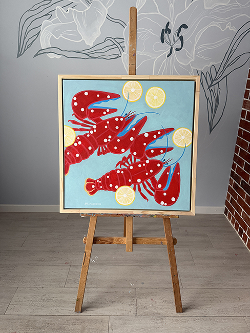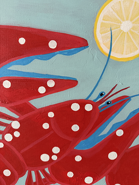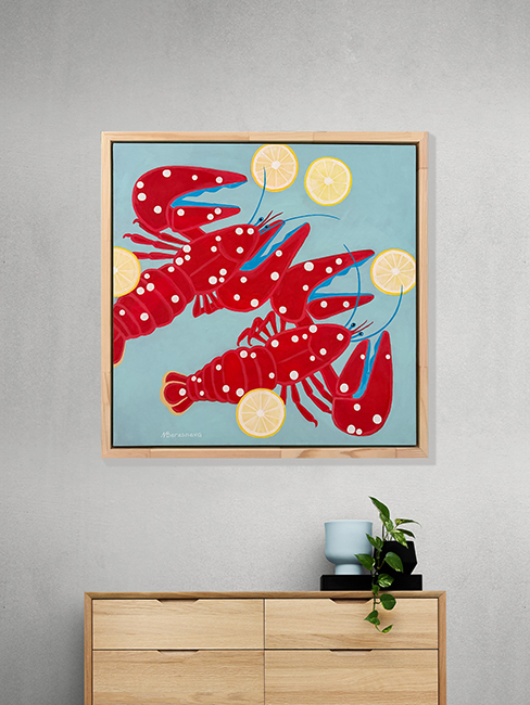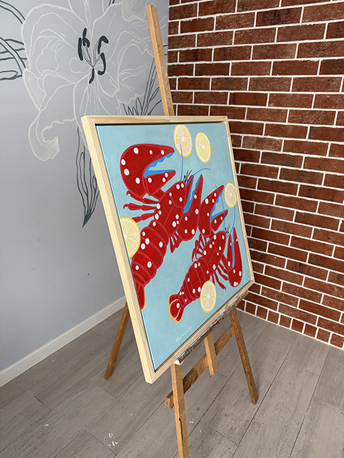 Лазурное полотно передает беззаботное летнее настроение. Главными героями картины являются два ярко-красных в белый горох лобстера. Их щупальца тянутся к спелым и сочным лимонам. Кажется, вот-вот, и один из лобстеров добьется успеха, ухватив ускользающий фрукт.