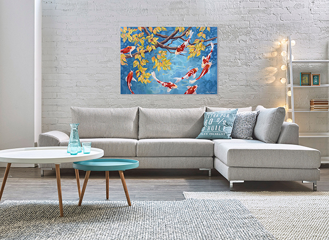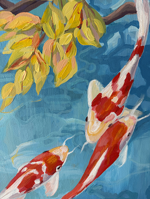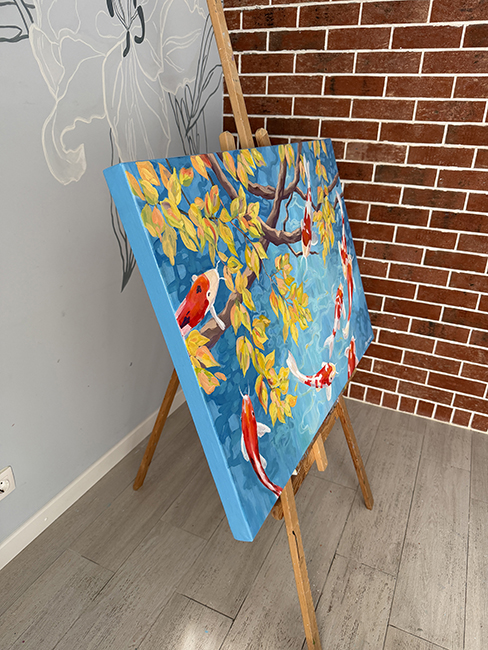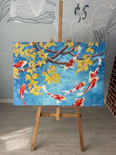 На картине изображен тихий бирюзовый пруд с прозрачной, чистой водой. Извилистые ветви деревьев, пышно украшенные желтыми листьями, отражаются в воде необыкновенными узорами. Спокойствие уединенного места нарушают только игривые рыбки кои. Их красно-белая расцветка одновременно контрастирует и дополняет пространство. По легенде кои могут плыть не только по воде, но и по воздуху, что отражено на картине. Рыбки кои — символ смелости, силы духа и осуществления мечты. Если есть цель и огромное желание, даже рыбы могут летать.