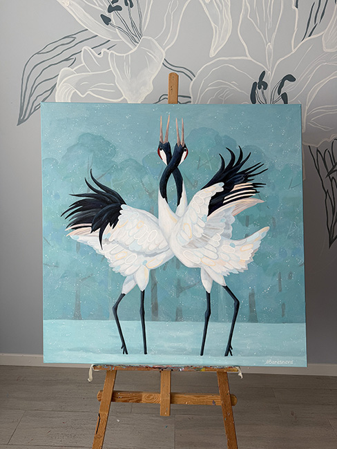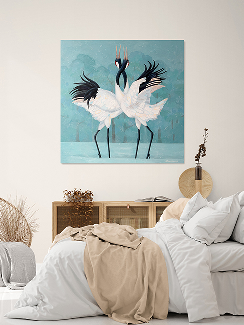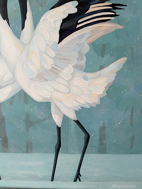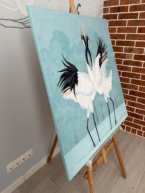 На картине изображен заснеженный лес в светло-бирюзовых оттенках. В центре полотна — танец двух японских журавлей. Танец — воплощение совершенства и изящества двух великолепных птиц. Их белоснежные перья, словно пушистые облака, контрастируют с глубоким черным цветом крыльев и длинных, тонких шей. Красно-черные отметины на головах придают им царственный вид. Кажется, их танец — это не просто природное явление, а ритуальный обряд, древний, как сама земля. Невероятная синхронность их движений, их взгляды, направленные друг на друга, говорят о глубокой связи, о немом диалоге душ. В этом застывшем мгновении — вся красота и хрупкость природы. Танец журавлей на фоне заснеженного леса — это гимн жизни, ее вечному обновлению, ее непостижимой силе. Картина выполнена акриловыми красками на льняном холсте, натянута на подрамник. Края картины прокрашены, ее можно вешать без рамы. Картина покрыта лаком от выцветания и пыли, она сохранит яркость на десятилетия. Размер 100х100 см, ширина подрамника 2 см.