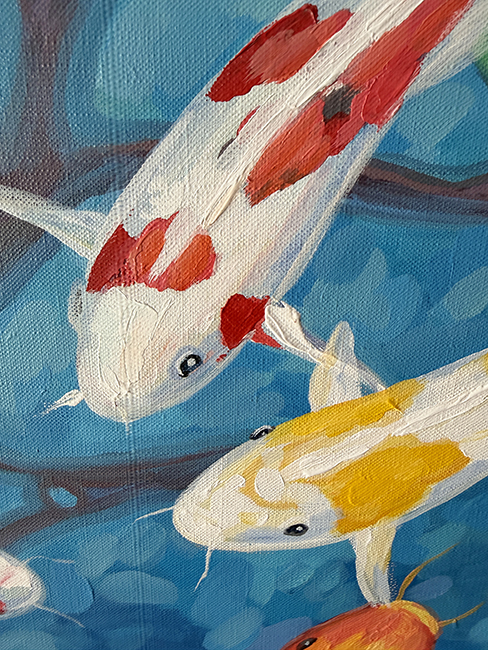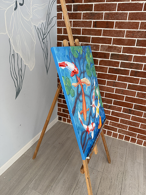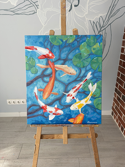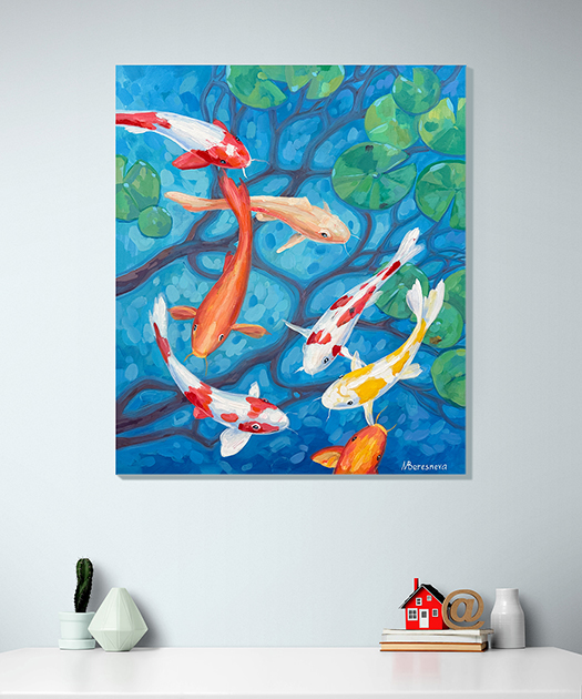 В глубине тихого пруда, где водная гладь отражает небесную синь, раскинулся мир умиротворения и природной красоты. Здесь, среди изумрудных листьев кувшинок обитает особая жизнь — жизнь семи грациозных рыбок кои. Их грациозные движения напоминают завораживающий танец, полный скрытого смысла и природной гармонии. Рядом с прудом растет дерево, чьи ветви изгибаются, словно стремясь коснуться его прохладной воды. Но не случайно семь рыбок кои нашли свой дом в этом райском уголке. Число семь, издревле считающееся числом удачи и благополучия, обретает здесь особое, магическое значение. Каждая рыбка, в своем стремительном и одновременно неторопливом движении, словно несет в себе частичку древней мудрости и обещание грядущего счастья. Картина выполнена акриловыми красками на льняном холсте, натянута на подрамник. Края картины прокрашены, ее можно вешать без рамы. Картина покрыта лаком от выцветания и пыли, она сохранит яркость на десятилетия. Размер 70х60 см, ширина подрамника 2 см.