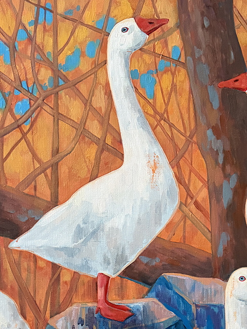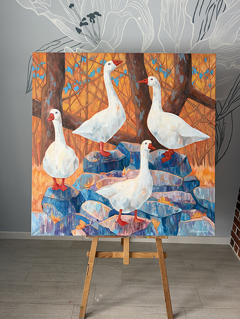 На картине «Вершина эволюции» перед зрителем разворачивается осенний пейзаж в багряных, терракотовых и оранжевых оттенках. В центре композиции возвышается гора из массивных камней, словно алтарь природы. На вершине этого каменного пьедестала, словно живые скульптуры, застыли четыре белых гуся. Грациозные изгибы шей и горделивая осанка говорят об их достоинстве и величии. Они смотрят вдаль с невозмутимым спокойствием, словно созерцая вечность.